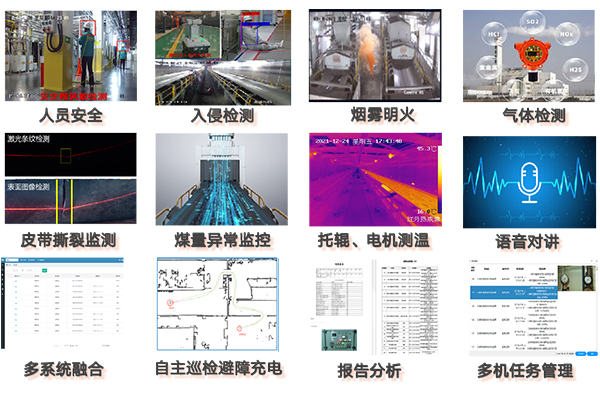 煤礦巡檢機器人通常配備了高清攝像頭、多種氣體探測儀、溫度濕度傳感器、揚聲器、高精度的定位導(dǎo)航系統(tǒng)等。可對入侵檢測、煙霧明火監(jiān)測、皮帶機撕裂監(jiān)測、堵漏煤檢測、托輥發(fā)熱判別、電機異常診斷、礦工人臉識別、火災(zāi)識別,以及異常站位識別、現(xiàn)場氣體檢測等功能。